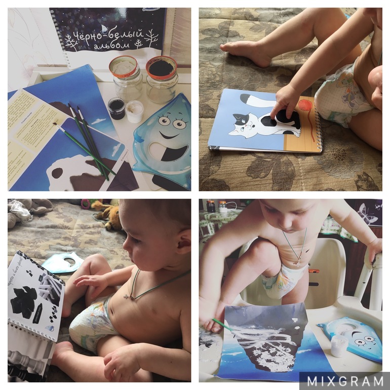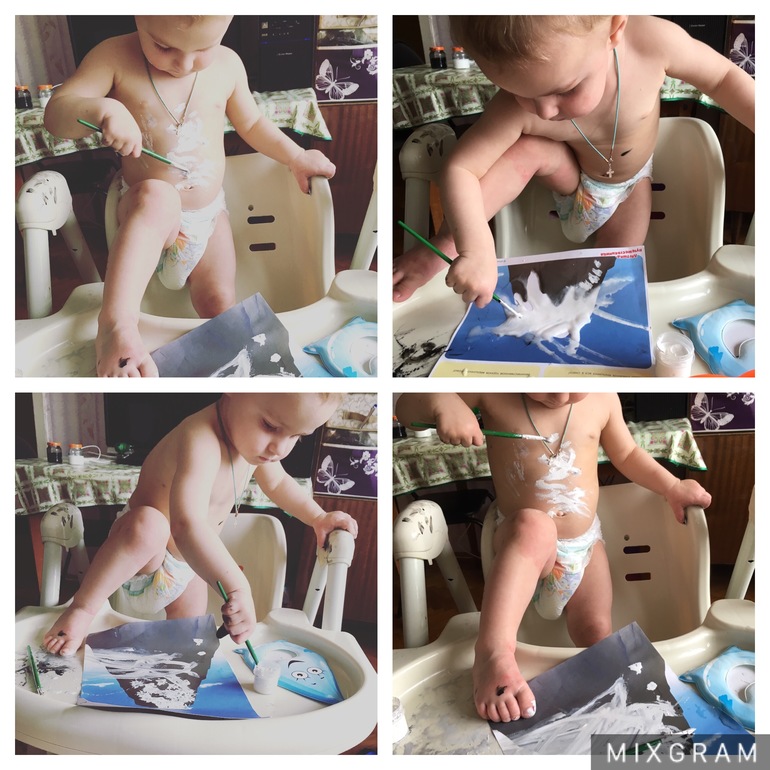 Творческое развитиеОчень забавное у нас получилось рисование) Недавно я поняла, что вообще не уделяла внимание чёрному и белому цвету, а зря, они же тоже основные. Мирослав, конечно знает их, но вот, конкретно игр с ними, не было. Начали с того, что позвали нашу капельку из Творчества с пелёнок, взяли карточки и черно-белый альбом. Почитала, какие бывают оттенки у этих цветов, какие предметы вокруг чёрные и белые. Поиграли с трафаретом - котиком. Подкладывали карточку и у белого котика появлялись чёрные пятнышки, а чёрного, белые. И приступили к нашему любимому эксперименту - окрашивание воды в закрытых баночках. И тут... Мирослав начал играть по своим правилам. Трясти баночки, он не хотел, он требовал их открыть, вот, прям требовал. Ладно, открыла. Сын повозил пальчиком в воде, открывал и закрывал баночки. А я только и могла, что просто проговаривать его действия. Потом предложила порисовать ему красками, сын радостно закричал "Ка-Ка-Ка". Но и тут меня ждал сюрприз. Как обычно, у нас два листа из "Моих первых шедевров", на одном листе я сама показываю, как рисовать, на другом он рисует сам. Заданием было, прикрыть верхушку горы снегом. Мирослав не дал мне показать, что надо делать. Он отобрал у меня кисточку и начал рисовать сам. А когда я снова попыталась рисовать вместе с ним, он убрал мою руку. Окей) сам, так сам) Сын так сосредоточено рисовал... губы поджал, мазки кисточкой были очень эмоциональные, резкие, не проронил ни звука. Только через 5 минут, выдал "КА", наверно имел ввиду "красиво", или "краски", или "Картина"😁 Этот рисунок, я точно сохраню, это первый, именно его шедевр) Я недавно, кому-то писала, что бодиарт-это не наше, мы таким не занимаемся. Оказывается, на животе и ногах очень удобно рисовать. Потом сын разукрасил стульчик. Весело) сын доволен, а я вообще была только наблюдателем) ещё веселее стало, когда я вспомнила, что уже, как 3 дня, нам отключили горячую воду) Но это мелочи) сын помыт, стульчик помыт, а на холодильнике красуется рисунок Мирослава)