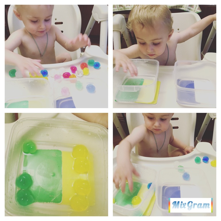 Сенсорное развитие и нейропсихологияУ нас столько новых игрушек-занимашек появилось. Обо всем по-порядку) Я наконец, решилась на гидрогель. Он какой-то не очень. Может я не разбираюсь в гидрогелях, но мой пока "рос", расслоился и вообще он очень хрупкий, прям очень. Все такие? Я так и не дождалась пока он набухнет до конца, мне хотелось поскорей его использовать. А так, как он разноцветный, то повторим цвета. Карточки-оттенки я приклеила ко дну прозрачного контейнера (с внешней стороны). Налила немного воды, зачем-то🤔 решила, что так прикольней. Рассыпала гидрогель на столик и объяснила, что нужно разложить шарики по цветам. Сначала, Мирослав собирал как попало, потом я ещё раз объяснила и показала. И тогда, он безошибочно рассортировал остальные, несколько раз. А потом, сын нечаянно сжал гидрогель в руках и он раскрошился. Мирослав, прям заливался от смеха. Не знаю почему, но ему очень понравилось его крошить, собственно этим и занимались пока папа не пришёл. Какие вы знаете интересные игры с гидрогелем?
