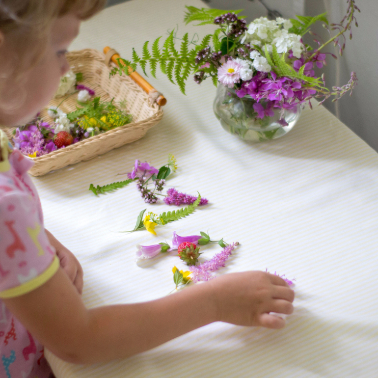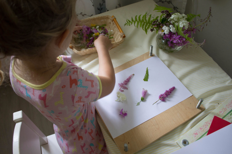 Собирали букеты, потом выкладывали орнаменты и слова из цветов, а сейчас положили все под пресс, планируем сделать панно.