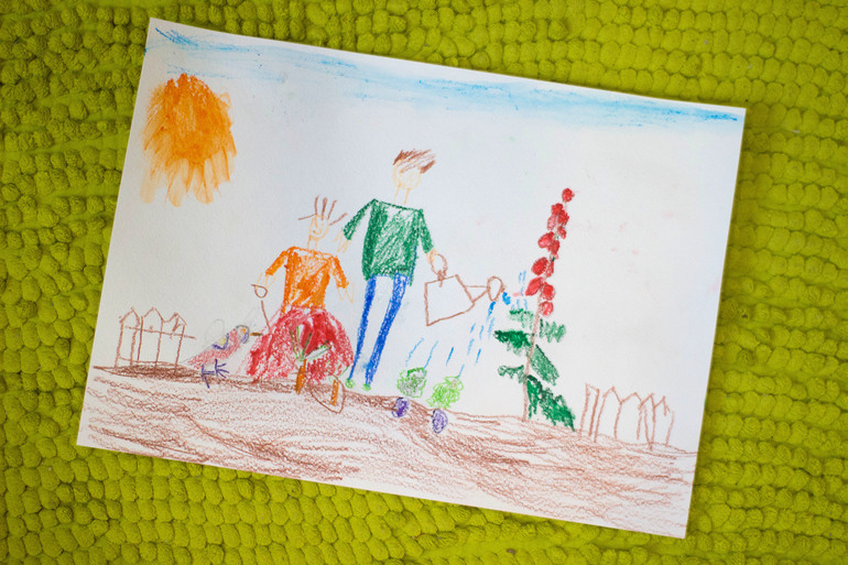 Это Варя рисовала себя и дедушку на огороде акварельными карандашами, ее любимая часть в конце, провести по рисунку мокрой кисточкой, чтобы создать эффект акварели.