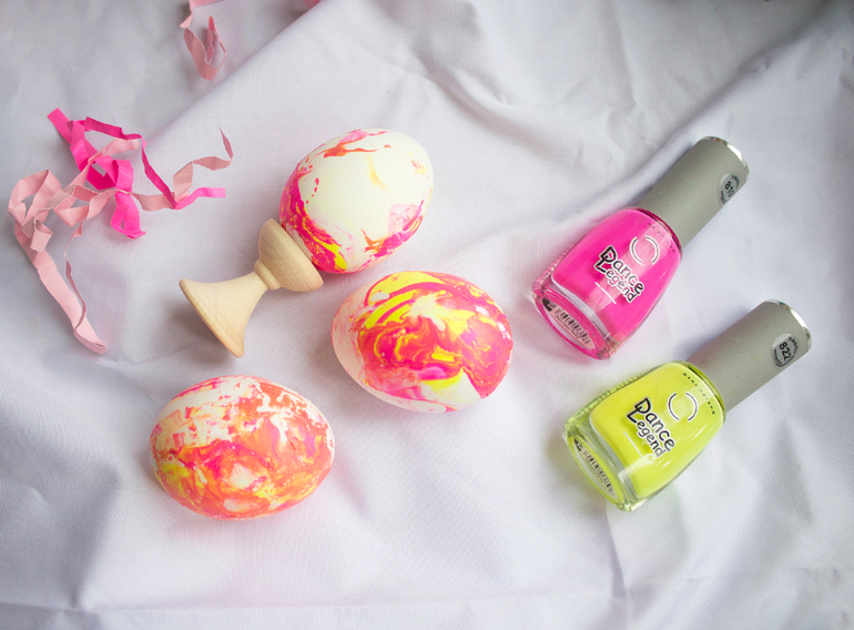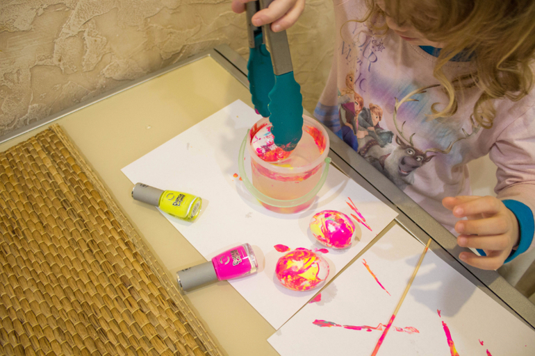 Для первой нам понадобились лаки для ногтей, два цвета нужно капнуть в воду, зубочисткой сделать узоры на воде, затем окунуть скорлупу от яйца (содержимое выдуть), потом вынимая, лак от воды перетечет на яйцо, образуя красивые разводы.