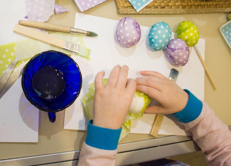 И второй - это декупаж на яйцах. Чтобы салфетка приклеилась, а яйцо осталось съедобным, вместо клея нужно использовать яичный белок.