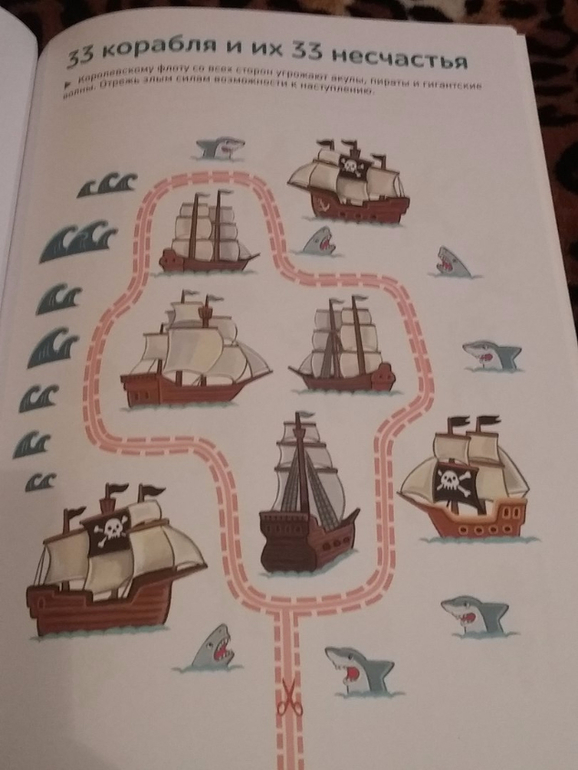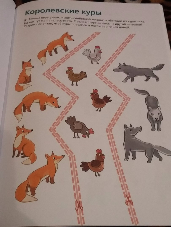 Есть задачки с несколькими действиями. Например, "В королевском зверинце полнейший беспорядок! Звери выбежали из клеток. Волки хотят съесть зайцев, тигры гонятся за оленями, лев хочет съесть зебр! Надо спасти зверей! Разрежь лист так, чтобы все остались целы."
