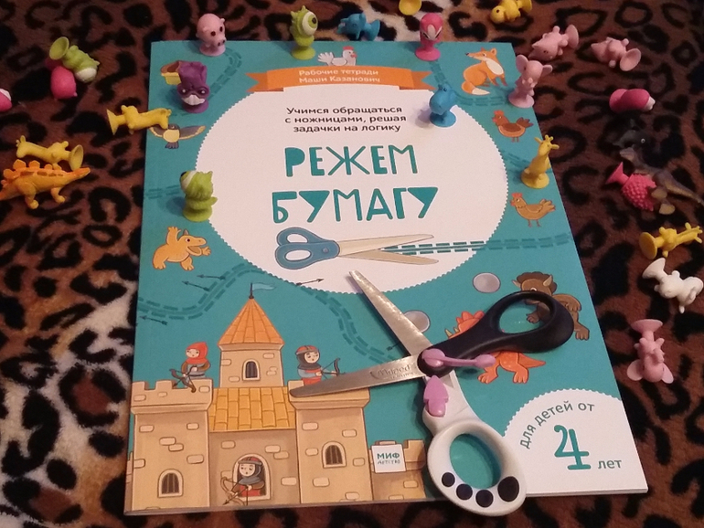 Расскажу еще об одной рабочей тетради Маши Казанович. Эта тетрадь тренирует навыки обращения с ножницами в игровой форме и развивая логику.