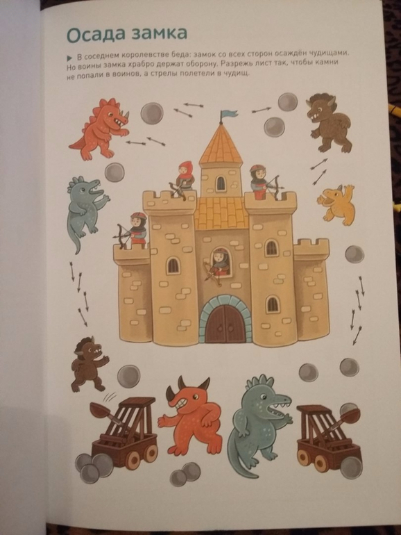 В книге много заданий на различные виды разрезов. Дочери очень понравилось слушать задания, ведь все они формулируются в сказочной форме и в них есть короли. принцессы, рыцари и волшебные замки. В каждом задании спрятана логическая задачка, решить которую можно с помощью ножниц и правильных разрезов.