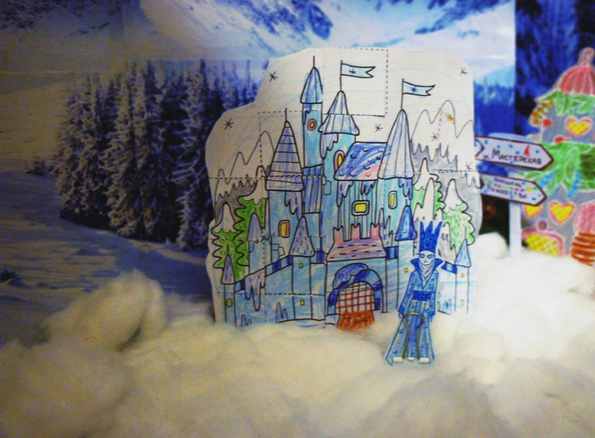 Утром, подкрепившись волшебными снежками, Кики отправилась по совету эльфов в снежную долину, чтобы узнать заветное желание Королевы. Там на глади ледяного озера была надпись "дворец". Стали мы его делать как полагается из кусочков сахара, но ничего толкового не вышло. Приуныли. А тем временем Кики выполняла бумажное задание от эльфов и тут нас осенило: вот же он! Этот новый чудесный дворец! Осталось только мне нарисовать Королеву. Расположили дворец на окраине городка, вблизи бескрайней белизны и тишины гор. Снежная королева была безмерно счастлива!