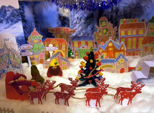 Следующим утром в городок пришли северные олени! Вот радости было для всех жителей! Они олеников и кормили, и гладили, и просто на них любовались :-) Ещё утром Кики прошла весёлый квест. В письме эльфы сказали, что им надо поставить оленей в упряжку, но какого оленя как зовут и кого за кем поставить, они не знают (очевидно в школе эльфов они не были отличниками). У них нашлась только подсказка - картинка с изображением кроватки и со стрелочкой в сторону подушки :-) Кики не сразу сообразила, что надо делать, потому что ещё никогда с таким не сталкивалась :-) :-) Я подсказала, что кажется это похоже на её кроватку... Она побежала и нашла под подушкой картинку с изображением стола :-) поискав немного, на ножке стола нашла картинку со стиральной машинкой, на ней картинку со стулом. Я подсказала, что кажется это очень похоже на её стульчик :-). Она побежала, повертела стул и нашла картинку со шкафом:-) не сразу я смогла её убедить, что её шкаф похож на изображенный на картинке :-) Пошла к шкафу и нашла там картинку с ёлкой :-). Побежала к ёлке и та-дааам, нашла на ней свёрточек, висящий на золотой тесёмке. А там как раз вся нужная информация. Приклеила я с изнаночной стороны оленей белые бумажки и стала показывать Кики каждого оленя по очереди, чтобы она решала какого оленика как зовут :-) потом я подумала, что очень не хватает саней! Сделала шаблон, вырезала, склеила и поняла, что для полноты не хватает самой упряжки. Приклеила к ним суровую нить, пропустив через сани и получилась совершенно настоящая упряжка! Когда всё это оказалось в городке, то все жители выбежали посмотреть и испытали просто восторг! :-) Теперь в городке аттракцион "посидеть в санях Деда Мороза"! Эльфы, гном и все остальные выстраивались в очередь, чтобы там посидеть:-) а один эльф даже пытался оленей уговорить прокатить его, но тщетно, ведь они сдвинутся с места, только после волшебных слов, написанных в том самом свёртке, что нашла Кики.