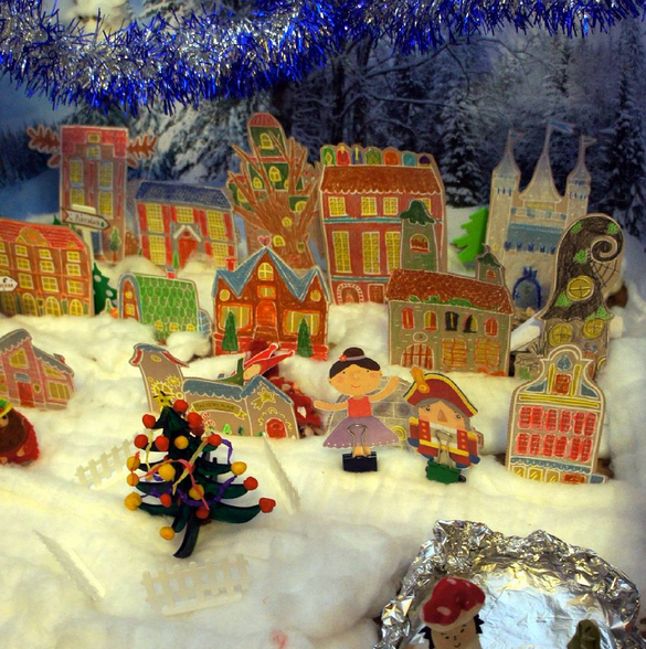 В городке появилась балерина и влюблённый в неё Щелкунчик ночью залил настоящий каток. (Но! Каток мной оказался залит неровно! При вытаскивании балерины, её "коньки" поломались!) Кики всё равно умудрилась радостно со всем этим играть и палочками их катать, пока и у Щелкунчика не растаяли и не поломались и его "коньки" :-) Остальным жителям тоже хотелось прокататься на катке и поэтому было решено очистить озеро от снега :-) На фольгированном озере (справа внизу фото), даже следы "коньков" остаются! :-)