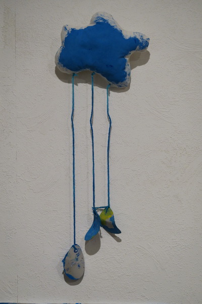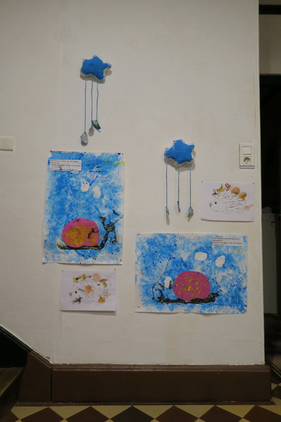 Облачко-подушка была сделана заранее организаторами, и дети, обмакивая его в краску, рисовали дожливый фон. Потом пальчиками рисовали пятнышки на улитке, приклеивали ее и дорисовывали саму обитательницу домика.