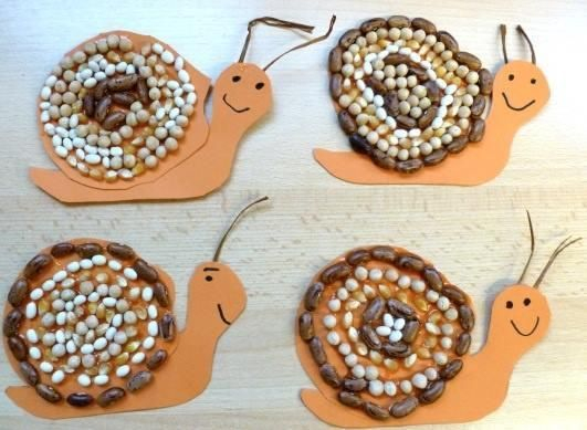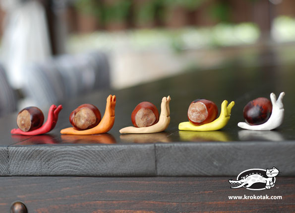 А можно вылепить улитку-слизняка из пластилина или соленого теста, а домик сделать из плода каштана (как раз сейчас урожай), или подобрать на улице пустую раковину.