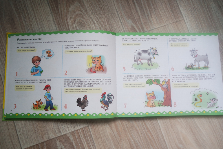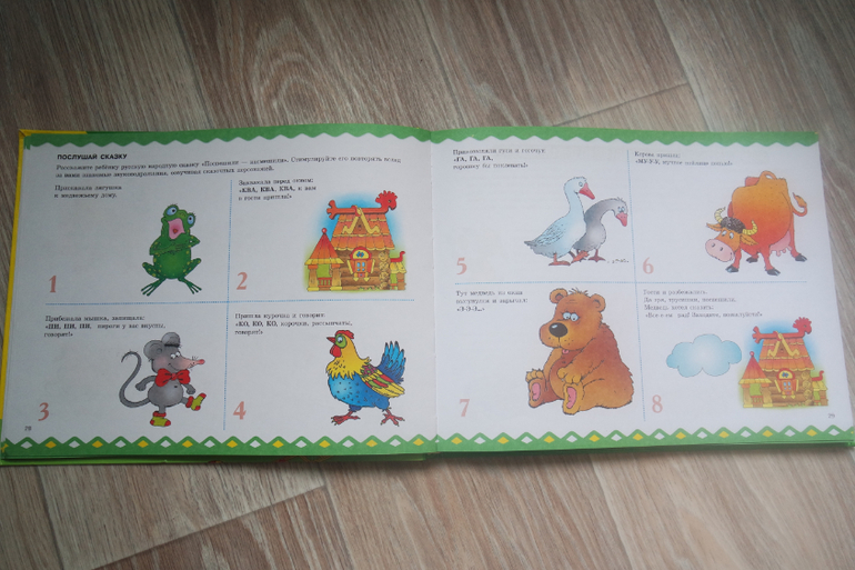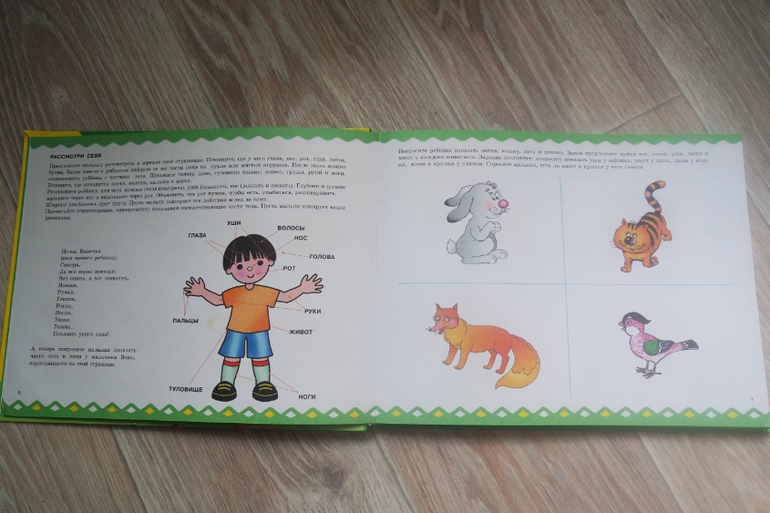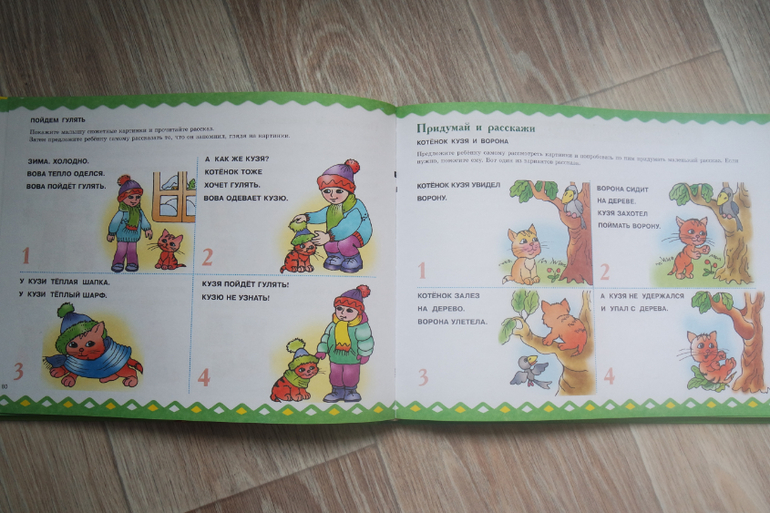 Мне не нравится как автор формулирует задания. Я привыкла к рассказу-сказке, который я читаю и мы вместе с малышом понимаем суть задания. Еще удобно, когда выделены ключевые моменты, символы-иконки, слова-подсказки и я сама сочиняю на ходу...Здесь трудночитаемый текст Почему нельзя выделить абзацы? Строчки слишком длинные: тяжело читать сверху вниз. Мама должна заранее ознакомиться с заданием, но ребенок часто сам выбирает страницу, а я теряю драгоценное внимание....В защиту автора скажу, что задания подробно описывают действия мамы и малыша.