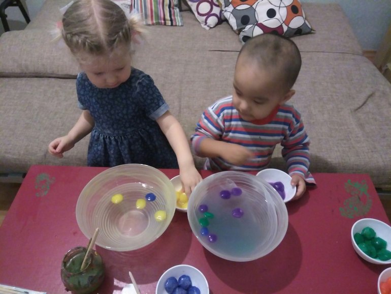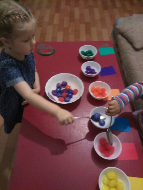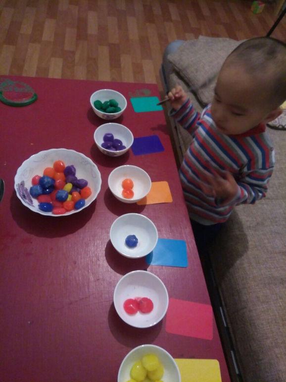 Пока вкусняшки застывали, мы с детворой поиграли по нашему новогоднему адвенту. Тема сегодняшнего дня «Лёд». Заранее заготовила цветной лед, взяла карточки из . Задача - сортировка по цветам. Очень увлекло и мою зефиринку и ее друга (2,6).