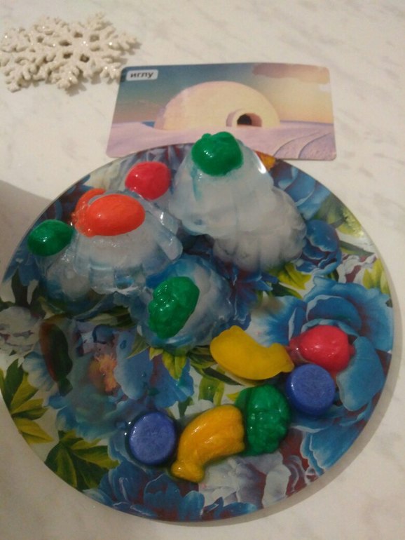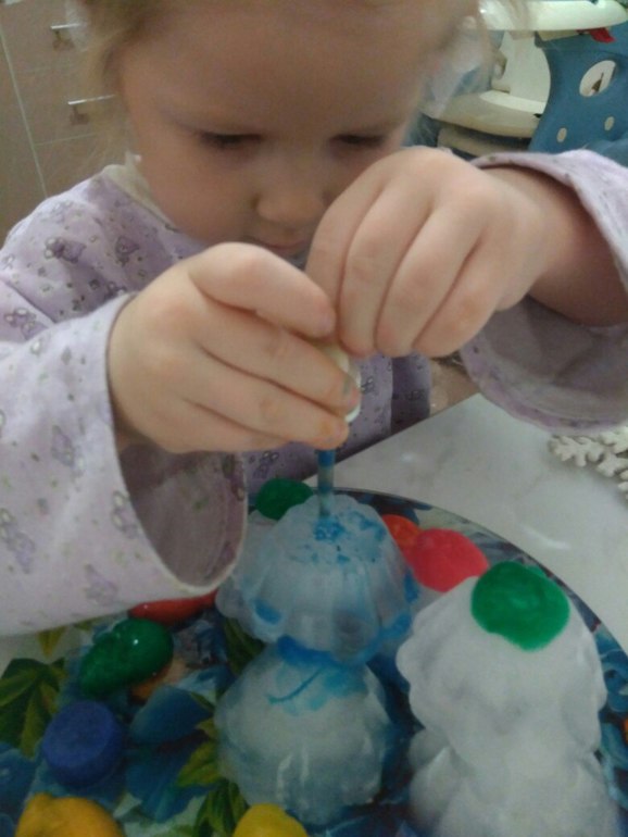 И построили ледяной дом Иглу) Слава решила его немного приукрасить: сначала ледяными цветными фигурками, а потом подкрашенной водичкой)