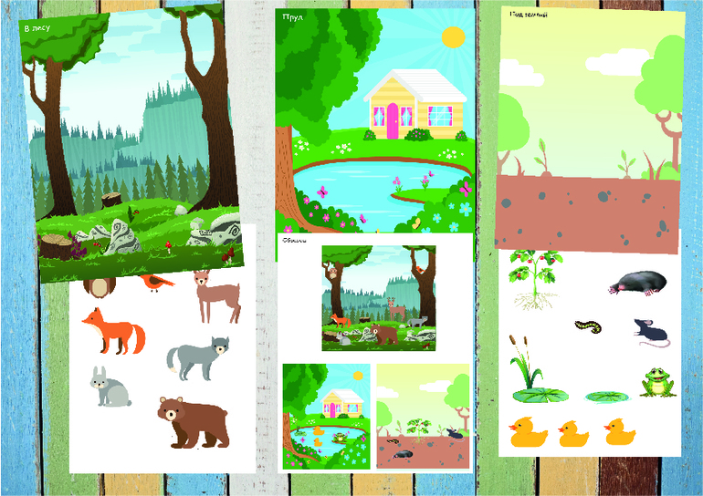 - 3 фоновых рисунка - среда обитания: в лесу, пруд, под землей;