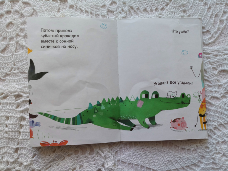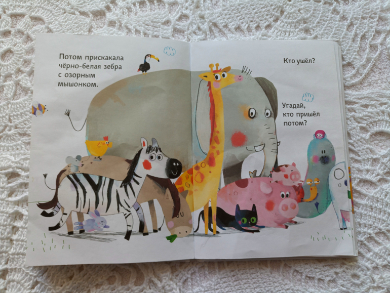 Книга для развития внимания и памяти. Покупала трехлетней Анюте. Она упрямо игнорирует все виммельбухи , игры на развитие внимания, памяти... Все то, что обожает старшая дочь, не могу подать средней... И вот мое первое ( и уже год единственное) спасение. Анечка очень любит листать страницы....этого нет в виммельбухах... А здесь хохочет, играет в прятки со зверями)))) Ей очень нравится!!! Книга на 100% оправдала ожидания. И даже больше...младшая рассматривает ее с года... Кстати, иллюстрации мне не нравятся. ..Но маленькая дочка ее часто приносила и тыкала пальцем, спрашивала кто?, рассказывала кто как говорит. А ближе к 2 годам стала играть в прятки!!! Сама начала говорить " Ой, мяу-мяу нет"....))) И задорно хохочет как Анюта))))