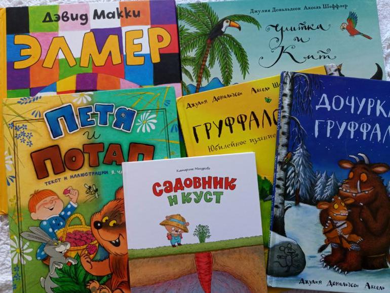 Элмер- самая главная книжная любовь!!!! ( хотя у старших детей интерес к этой серии книг проявился намного позже) . Так же было с " Улиткой и кит". Старшие оценили только в 4 года, а вот Люда проявляла интерес с полугода....Хотя какой там может быть интерес....но очень радовалась, когда слушала)))) "Петя и Потап" и "Груффало" наши семейные любимчики!!!!!!