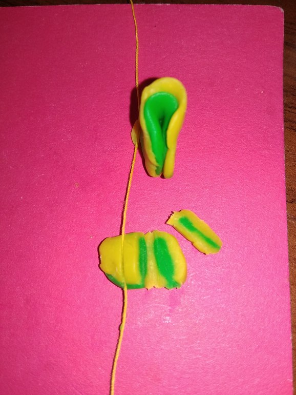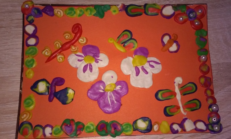 Фиалки из пластилина. Сами центральные цветы несложные: на кружочки нанесли полосочки. Бабочек и обрамление мы делали следующим образом: складывали кружочки различных цветов друг на друга, сворачивали пополам и разрезали нитью: