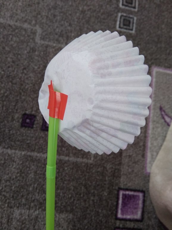 Каллы: в трубочку вставляется гигиеническая ватная палочка, одна сторона которой окрашена в жёлтую краску, затем "укутываем" получившуюся конструкцию ватным диском и фиксируем при помощи клея. Из трубочек как-то раньше мы делали ещё цветы при помощи бумажной основы для кексов. Можно и самим вырезать цветок или цветки разных размеров и цветов - из них собрать один; для совсем маленьких детей подготовить цветочек и кружки, которыми его украсят. С обратной стороны получившийся цветок прикрепить к трубочек скотчем или любой наклейкой.