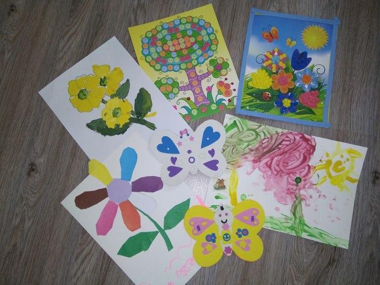 Раскрашивали гуашью, акварелью,даже масляной пастелью пробовали писать) Доча дружит и с пальчиковыми красками (ее пейзаж на фото), а вот сыну они не приглянулись: долго наблюдал за мной и сестрой, согласился обмакнуть пальчик и тут же помотал головой и позвал "куп-куп". Аппликация цветик-семицветик рисовала я, вырезала, распределила на листе, приклеила сама дочуля - это ее самая любимая работа оказалась, до сих пор висит на видном месте).