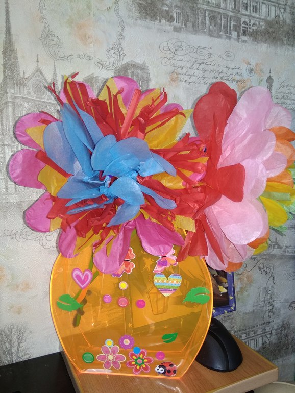 Ещё один букет) На 8 марта подарили дочери набор от Bondibon. Ребенок пришел в восторг уже при виде вазы в наборе: ваза большая А4, мягкая, ярко оранжевого цвета, в комплекте наклейки для ее украшения. Инструкция наглядная. Цветы собирали вдвоем, так как с тонкими листами дочери пока тяжело справляться - легко рвутся. Сразу сделали два цвета. Вчера дочь достала и начала делать сама - сейчас три цвета в вазе. Бумаги и трубочек, шенилл-проволоки ещё много)