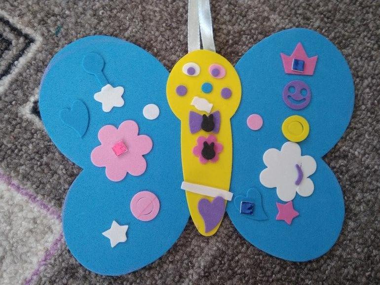 Цветы на синем фоне из помпонов: по образцу не получилось, клеятся плохо, рукой задевали уже приклеенные, сохли долго. И впервые сталкнулись с тем, что не было помпонов двух цветов (т.е. одного пакетика), коробка была запечатана. В целом нам это настроение не испортило, помпоны ещё остались) Брала тут https://www.labirint.ru/games/502741/Бабочки аппликация из мягкого пластика, играет дитё в нее регулярно, закончились сами бабочки -вырезаем теперь основу из цветного картона и декорируем. Брала в Читай-город.