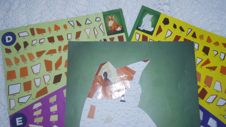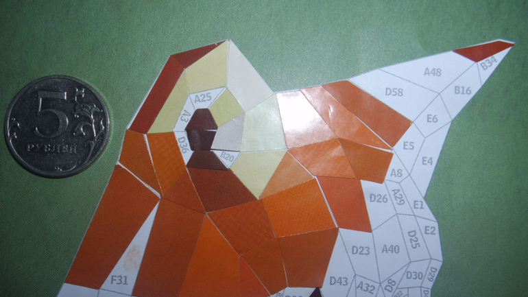 Автор советует работать пинцетом. Дочки работали пальчиками, думаю, для пятилетки сделано хорошо, аккуратно). Это кусочек лисы.