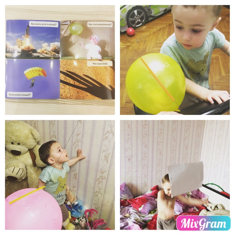 На самом деле, когда уже на протяжении 2-х лет сама развиваешь сына, то ты ищешь это развитие везде, в любой обыденной ситуации. Вот, катает Мирослав свои машинки и катает, а потом ты видишь, как он второй машинкой пытается догнать тень первой. И я уже рассказывала сыну, что такое тень, но повторение, как говорится... Достала карточки с экспериментами для самы маленьких - это для меня, что бы рассказать красиво и понятно. Отбрасывали тень другими предметами, у сына даже самого получалось «поймать» тень. Следущая ситуация, вечером, пока папу ждали с работы, Мирослав играл с воздушным шариком, просто гонялся и конечно наэлектризовал его. Ему было весело, он бегает, а шар к нему липнет) тут и я подключилась, показала, что если потереть шарик об волосы, он липнет ко всему. Следующие пол часа сын бегал и лепил шар на все стены, двери, просил меня надуть ещё несколько шариков, хотел удостоверится, что это работает со всеми) Но вдруг, сын задевает шар об машинку, так удачно, что шар не лопнул, а сдулся, отлетев в другой край комнаты. Ага! Точно, эксперимент с ракетой. Это очень просто и нереально круто. К шару, на скотч крепится трубочка от сока, через неё продевается нитка, крепим один конец нитки под потолком, а другой внизу (например, за ножку стола) Ракета на старте, внизу... ведём отчёт...3...2...1... ПОЕХАЛИ!!! Надрезаем конец шарика и он взлетает под самый потолок) Вот это визгу было) 5 шариков запустили и даже когда они закончились, Мирослав кидал вверх ошметок) А сегодня, я сидя на работе, получаю фото, как Мирослав изучает, зачем нужен парашют. Опять же, ничего сложного) просто он по очереди кидал скомканный лист бумаги и прямой) конечно, после таких экспериментов есть и объяснение «Почему так произошло» Но писать его очень долго. Вся жизнь-это развитие) а у малышей тем более) Никакой учёбы, занятий, только игра)