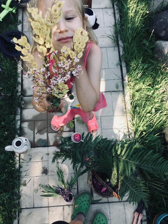 А ещё цветы, тут конечно больше пойдёт о девочках! Мы заходим в цветочный и нюхаем, покупаю всегда хотя-бы не большой букетик. Вообще сейчас любовь к флористики у нас огромна, поэтому я привлекла и тему запахов.... сюда. Розы, пионы, кусты шиповника и сирени, любуемся красотой и запахами, учимся составлять букеты и сушим гербарий.