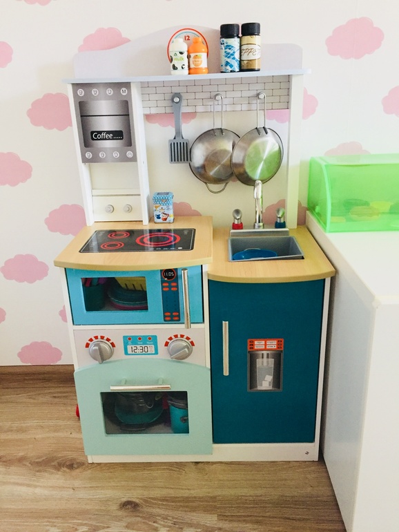 Так же у нас возник вопрос по кухне. Она у нас деревянная. Но мы любим играть с водой. Поэтому часто играем просто с кастрюльками в ванной. Если детки хотят с водой играть, берите пластик.
