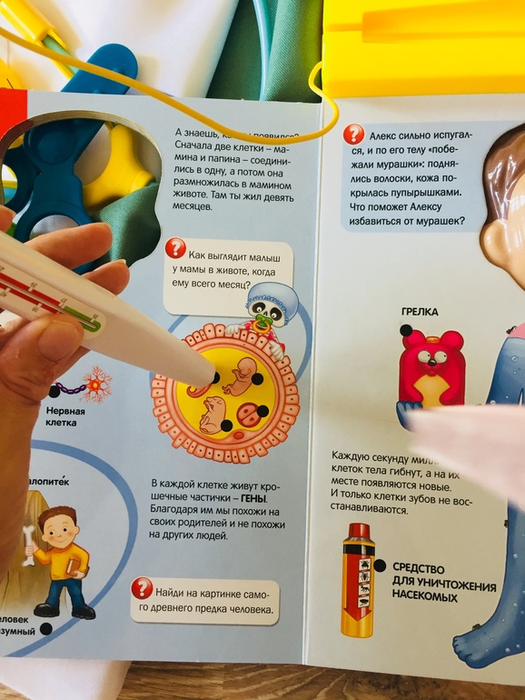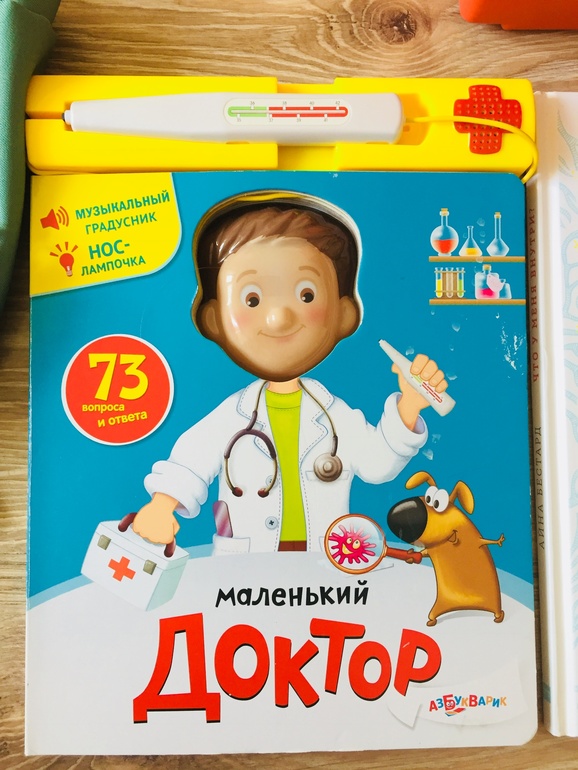 "Маленький доктор" у вас интересный, жаль, что его уже нет в продаже. У нас энциклопедия от Роббинс "Секреты человека" с окошками идёт на "ура". В игре "доктора" используем календарь, назначаем время следующего приема (заодно ориентируемся во времени по часам и времени суток), рецепт, применяем на себя разных докторов: так кто-то хирург, кто-то зубной врач - пациенты куклы со сломанной ногой, с раздувшийся щекой и т.д. В стационар кладём, наливаем в ложку "лекарство" пипеткой ((вода в чистых пузыречках из-под лекарств), лепим таблетки из пластилина, назначаем приседания, прыжки и др. Есть набор "зубастик" от playdog, его тоже часто достаем.