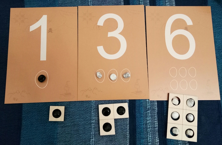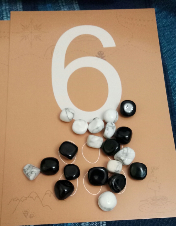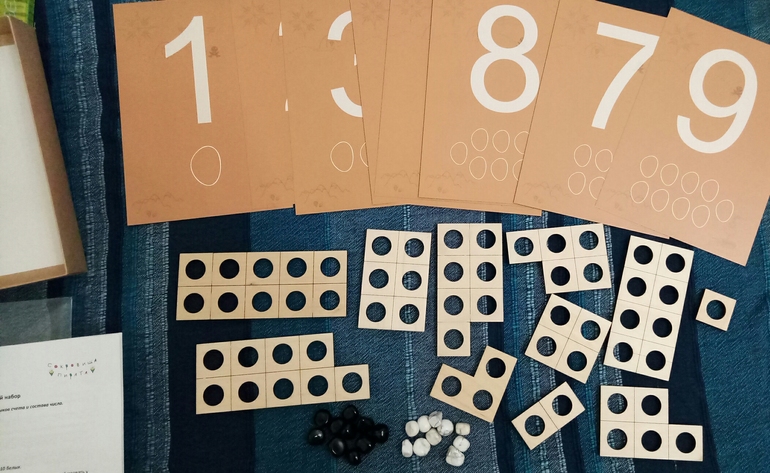 В наборе 9 карточек от 1 до 9, деревянные формы с отверстиями для камешков, от 1 до 10 , две 5, и 20 натуральных камней самоцветов, 10 белых и 10 черных. Камни обалденные, особенно черные, гладкие, тяжеленькие, приятно в руки брать!