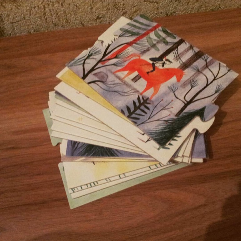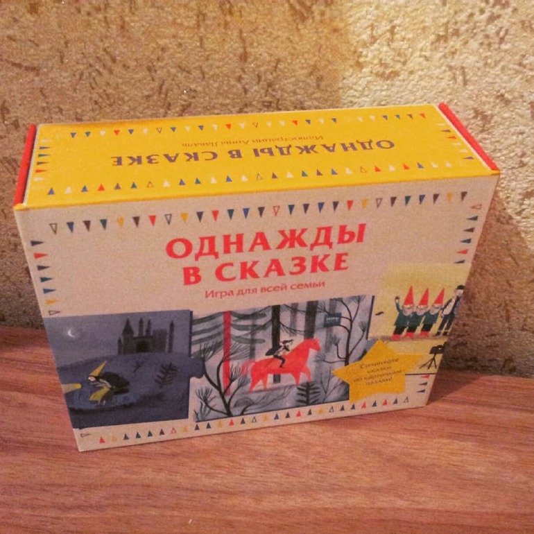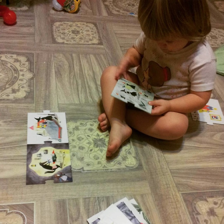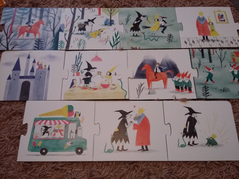 На первый взгляд задумка очень понравилась: в наборе 20 двухсторонних карточек, которые собираются цепочку пазлом. На карточках нарисованы картинки и собирая их в цепочку надо придумывать историю/сказку. Про злую волшебницу, принца на коне, принцессу...