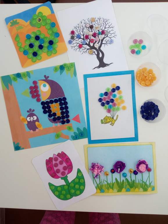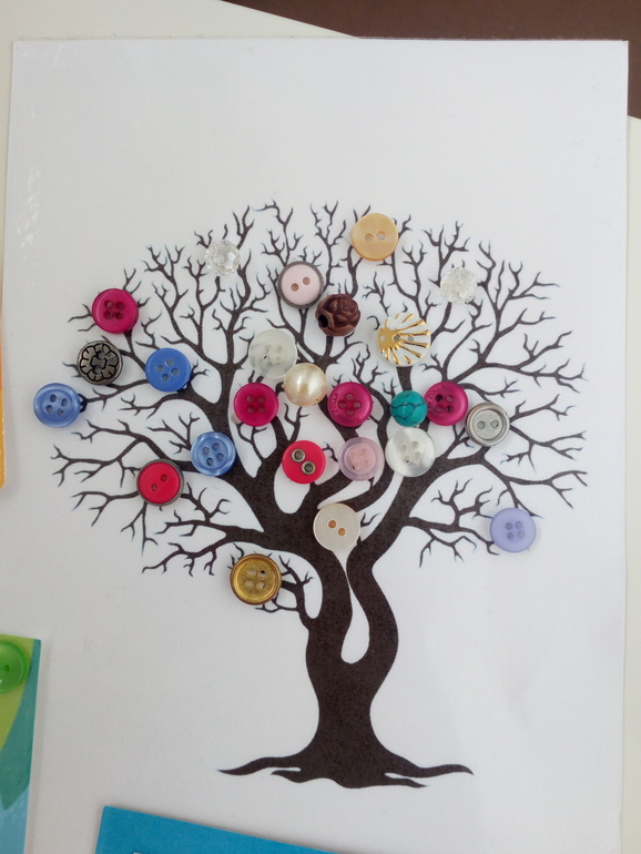 Дерево распечатала на картоне и сверху наклеила пленку для учебников. Пуговицы и бусины использовали из тех, что нашли дома, получилась такая сборная солянка.