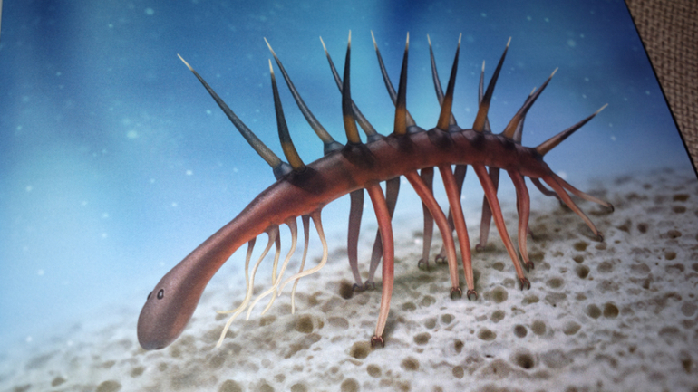 Это галлюцигения ( переводится как "порождение галлюцинации") Это животное было совсем маленьким, размером со спичку. Это такой червячок с острыми колючками на спине, длинной шеей и мягкими ножками.Жил он 535-485 млн лет назад.