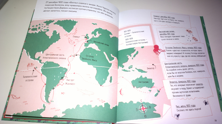 Конечно же я не могу пройти мимо разворота с географической картой ( мой любитель географии долго изучал маршрут корабля "Бигль", на котором Дарвин отправился в путешествие.
