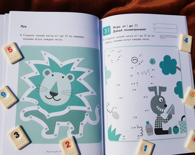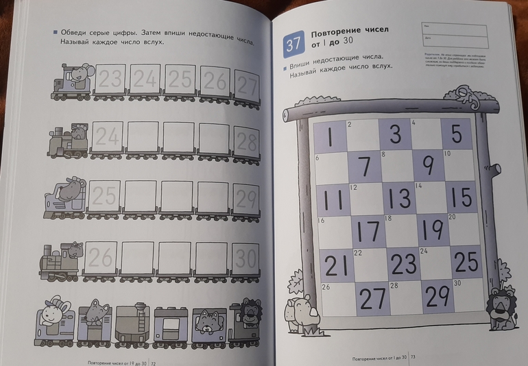 Вторая тетрадь Учимся считать 1-120 , на возраст 4-5-6 лет. В ней 40 заданий, из них первые 13 на повторение чисел до 30.