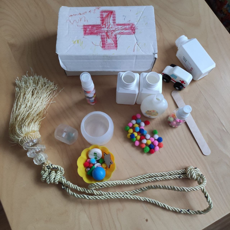 Ане 5 лет, она строгий врач, и следит, чтобы "пациенты" - младшие Оля и Макс, выполняли ее указания. На полу и на столе разложены инструменты: