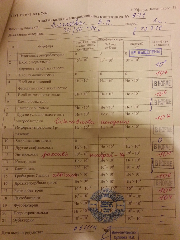 Здравствуйте! Получили анализы кала и на дисбак. я совершенно не понимаю что там но как видно что выделено красной ручкой.что то не очень...незнаю что делать.. Объясните что там у нас по всем анализам пожалуйста!