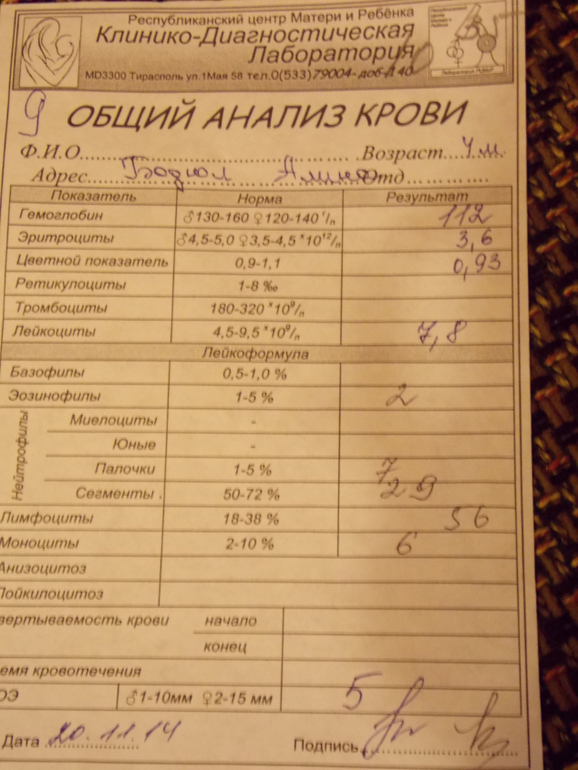 Здравствуйте, Татьяна Васильевна! мы снова к вам за советом. Доченьке предстоит зондирование глазика (вроде прошло все, но вот снова обострилось, и решили все-таки зондированию быть). Сдали анализы мочи и крови. Моча хорошая (слава богу), а вот кровь меня смущает. Посмотрите результаты, пожалуйста, и скажите разрешат нам сделать процедуру зондирования или опять придется ждать?