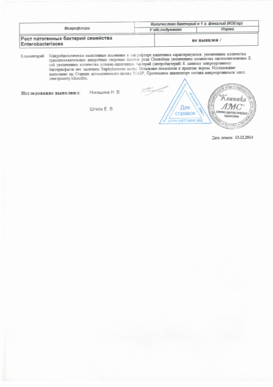 Добрый день, Татьяна Васильевна! Прокоментируйте, пожалуйста, результаты анализов. Нас особо ничего не беспокоит, единственное в кале присутсвуют не переваренные частицы еды, и иногда после съеденной молочки замечаю мелкие вкрапления белые. Пьем мальтофер, тк после ротовируса низкий гемоглобин. Стул два или один раз в день, колбаской. Капрологию сдавали дважды. Сначало без углеводов, а потом на углеводы еще. Цвет сейчас темный, но иногда наблюдаю белые мелкие вкрапления.