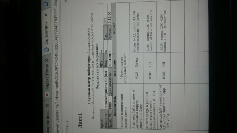 Здравствуйте! Помогите пожалуйста разобраться с результатами анализов. Ребенку 6 лет , в прошлую субботу поднялась температура 39, очень сильно болело горло, врач предположила ангину назначила антибиотик супракс, после двух приемов антибиотиков ребенку стало лучше не так болело горло и температура была 37,5 на второй день приема появилась сыпь на кистях рук и стопах ног ( на теле не было нигде) вызвала неотложку сказали сыпь как реакция на антибиотик при мононуклеозе, сыпь на следующий день пролла без следа, ребенок скачет -прыгает температуры нет, горло не болит, но увеличенны сосочки на языке. Сегодня пришли результаты анализов, можно ли по результату сказать что это 100% мононуклеоз?