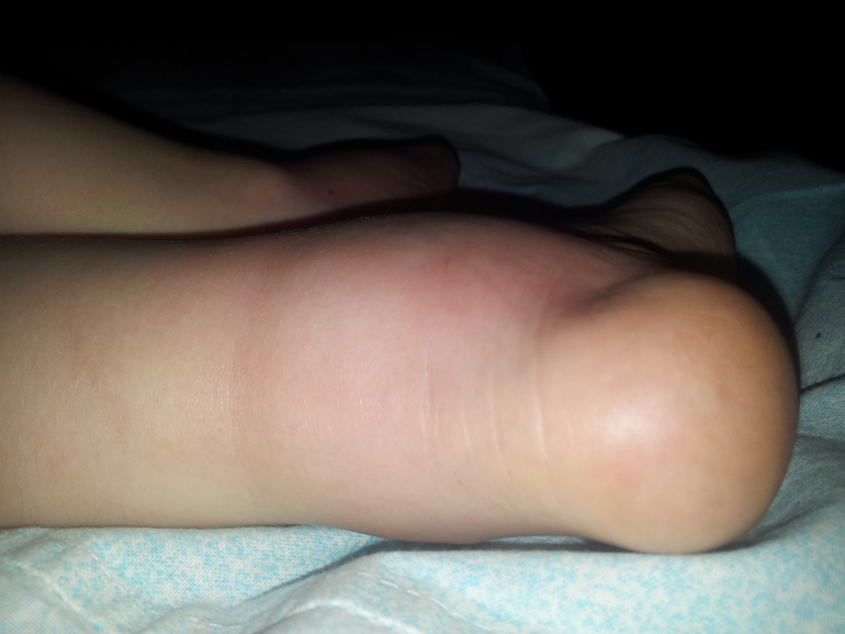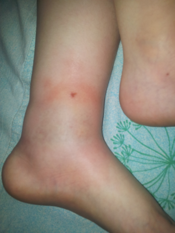 Утром и вечером мазали фенистилом и его же давали внутрь в каплях. Но отек и краснота увеличивались, при этом дочь стала ещё сильнее расчесывала вторую ногу, на ней появилась крапивница. В аптеке посоветовали псило-бальзам местно и кларитин внутрь. С утра 10-го дня начали применять эти лекарства по инструкции. К вечеру 10-го для вторая нога тоже стала опухать, красавица превратилась в сплошную красноту. Середина отеков на обеих ножках с синим оттенком, это видно на фото. Сами отеки иногда "горят", при этом весь 10-й день дочь на боль не жалуется, бегает во всю, тучает только зуд. Температуры нет. Мы находимся в глухой деревне, ко врачу попасть сможем только не раньше понедельника ((( Подскажите, как помочь ребёнку