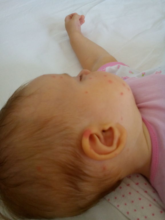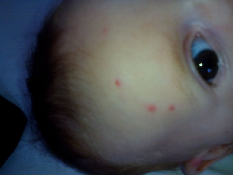 Ещё пара таких пятнышек на ручке и за ушком одна на волосистой части головы. Они не водянистые, явно зудящие, твёрдые, похожие на укусы мошки или другого злого насекомого. Температуры не было и нет до сих пор. На второе утро пятен прибавилось, сами они стали краснее, злее.