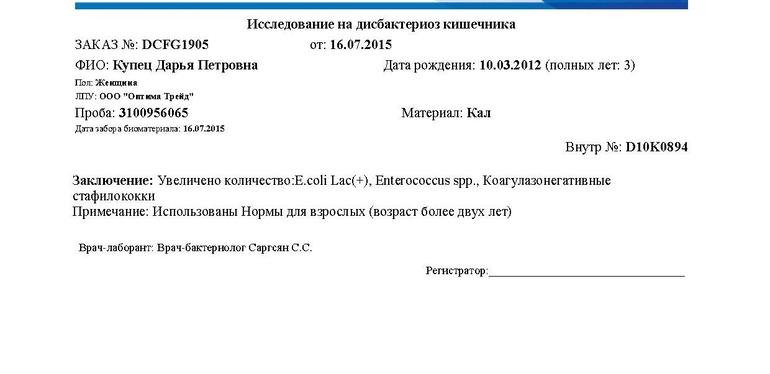 Дочери 3 года и 4 месяца. Где то год назад появились выделения и налет на половые губы, сходили мы к гинекологу сдали мазок и ничего не нашли прописали только ваночки с ромашкой и с слабым раствором пищевой соды. Но нам это помогло только на время потом опять все началось. Пошли к другому гинекологу сдали мазок и нашли stafilococus hemoliticus ++ и esherihia coli +, показали анализы педиатру и он сказал что надо лечить одновременно двумя антибиотиками, я вся испуганная пошла к третьему гинекологу, в этот раз мазок брать не стали, по последними анализами гинеколог сказал что все эти проблемы от дисбактериоза кишечника, так как бактерии из кишечника попали во влагалище и если будем еще принимать антибиотики то совсем убьем микрофлору кишечника, он прописал нам нормобакт, брызгать мирамистином и чистить налет с персиковым маслом. Нормобакт не пропили а решили сдать кал на дисбактериоз чтобы знать точно как лечить дисбактериоз. Результат ниже. Сдали анализы и на глисты так как гинеколог сказал что это может быть и из за глистов. Глистов не обнаружили.
