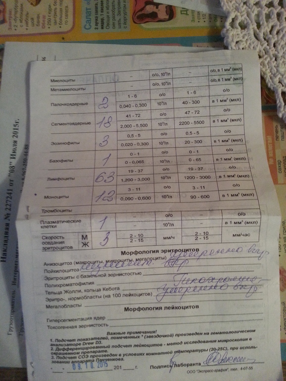 В анализе имеются признаки выраженной железодефицитной анемии (снижение гемоглобина, цветового показателя, гипохромия, анизоцитоз, пойкилоцитоз) и признаки воспалительного процесса (лимфоцитарный лейкоцитоз).