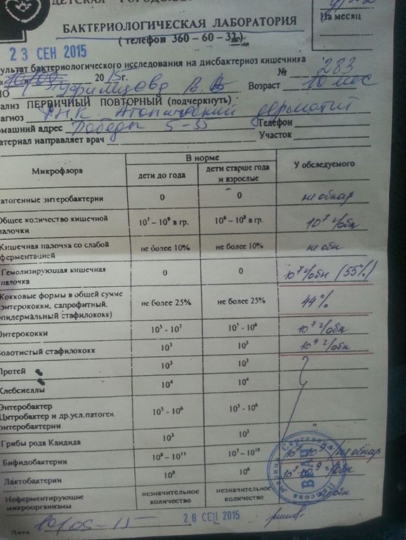 Добрый день. Начну с того что в 3 мес мы попали в больницу, где ребёнку проставили 5 дней антибиотики (амоксицилав), после месяц пили аципол, и после этого у нас стало высыпать на щеках. Поставили диагноз АД. Сейчас нам 7 месяц, и все это время щечки идеально чистыми не были никогда, иногда лучше, иногда красные. Мы полностью на гв, ничего аллергенного я не ем. Сдали анализ на дисбактериоз, нашли гемолизирующую кишечную палочку 55%, энтерокки 44% и золот стафиллокок, врач нам назначил след лечение: 7 дней пиобактериофаг 5 мл 3 раза в день, лактрофильтрум 1/3 таб 3 раза в день, фенистил. Потом месяц примадафилус и креон. На второй день приёма пиобактериофаг щеки стали багровыми, такие никогда не были, сейчас пьём 3 день. Подскажите пожалуйста нужно ли прекращать лечение или долечить до конца? До этого лечения тоже пили различные лекарства и на все была аллергия.