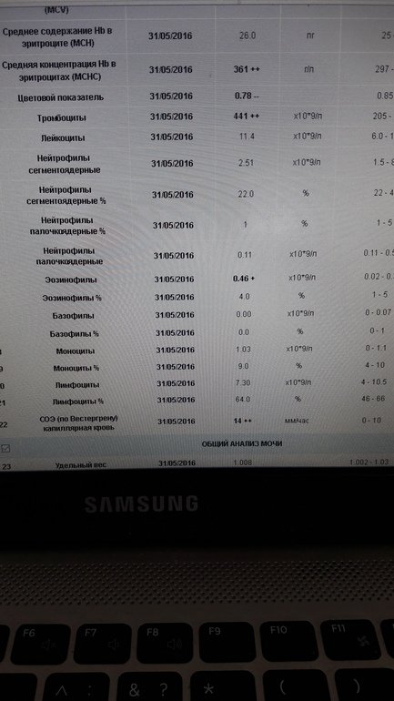 Здравствуйте,доктор! Прошу Вас прокомментировать наши анализы. 2 месяца назад были повышены тромбоциты 525(при норме до 350) и базофилы 1.3 (при норме 0.75) гематолог сказал,что все в порядке и попросил пересдать анализ через 2 мес,прививку мы отложили. Вот наши результаты,в целом все улучшилось( тромбоциты при ручном подсчете были 320!!!) Но вот Соэ? В прошлый раз она была 2.Очень беспокоит. Из всего что могу предположить,у нас активно режутся верхние зубы,сразу 4 подряд. Сейчас вылез глазнои и лезет передний,но ребенок нормально это переносит. Месяц назад была аллергия. Сыпь на животе, сильно на попе и паху,еще щеки. Держалась около недели,дней 10 может. Давала фенистил. Всего по 3-5 капель 3 р в день. Очень волнуюсь из за того,что около 2 недель назад нащупала у ребенка увеличенный лимфоузел затылочный (не болит ,не воспален,не увеличивается,только прощупывается и через несколько дней нащупала маленький совсем за ушком с этой же стороны,тоже никак себя не проявляет) ребенку 9 мес,мальчик. Никакими Орви не болели никогда,максимум сопли. Веселый,активный,аппетит хороший,сон обычный,нормальный. Врач настаивает на прививке (3 Акдс) без пересдачи. Пожалуйста,выскажите свое мнение. Благодарю Вас. Здоровья Вам и Ваши близким.