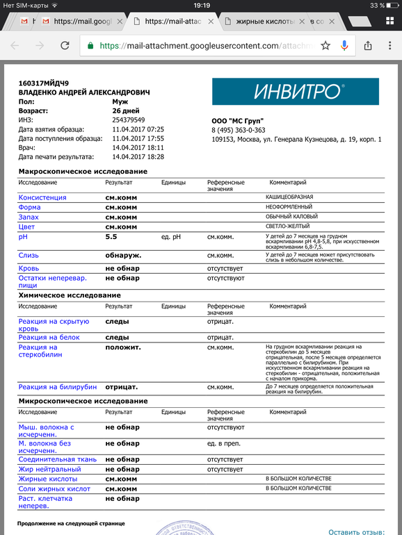 Следы крови и белка заставляют думать об аллергии и, как, следствие, о необходимости смены смеси, однако решение об этом принимается не только на основании анализа. Главным здесь является самочувствие ребенка - характер стула, наличие срыгиваний, кожные высыпания и т.д.