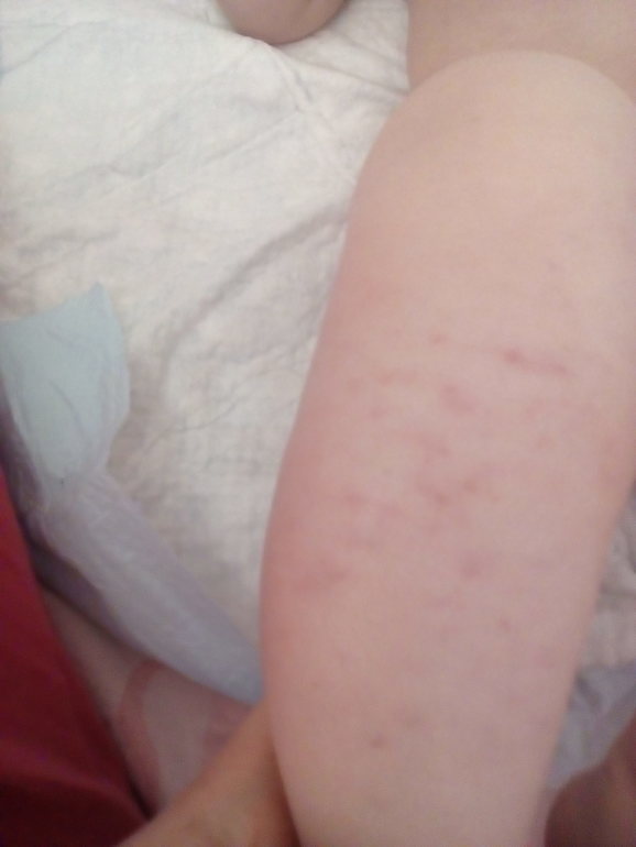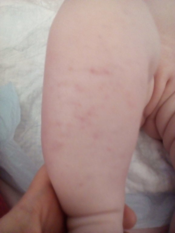 Добрый день. Утром обнаружили у ребенка на правой ноге пятна (на фото они светлые, а реально я подумала как будто синячки маленькие) идут по голени и чуть чуть выше сзади выше коленной чашечки. Больше нигде на теле таких пятен нет. Никаких признаков болеющего ребенка, как то повышенная температура, насморк кашель - нет. Неделю назад делали прививки - полиомиелит и АКДС, все прошло благополучно, даже повышения температуры не было. Изменений в поведении тоже нет - хорошо кушает, хорошо спит, все как обычно. Ребенку 5 месяцев.