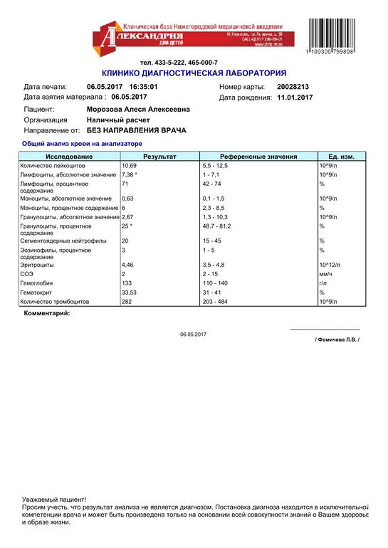 Наталья в Педиатр 9 лет Клинический анализ крови Здравствуйте, помогите пожалуйста расшифровать клинический анализ крови. Посмотрите еще 20 записей на эту тему Отменить Ответить Наталья Большое спасибо! 09.05.2017 Ответить Татьяна Прокофьева Здравствуйте, Наталья! У ребенка нормальный анализ крови. 08.05.2017 Ответить Наталья Ребенку 4 месяца. Ни температуры, ни кашля, горло хорошее. Только со стулом не очень-может 1 раз в день, максимум 2 раза сходить. 07.05.2017 Ответить прививка от ветрянки Витамин К Чаты Беременных Выберите чат: Январята-2026 Февралята-2026 Мартята-2026 Апрелята-2026 Майчата-2026 Июнята-2026 Июлята-2026 Августята-2026